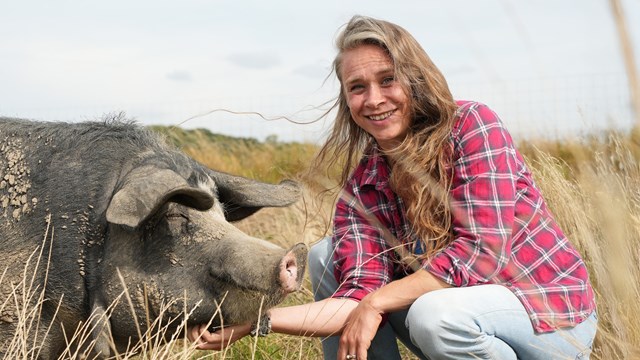 ”Vores kødproduktion bygger på recirkulering, klimahensyn og dyrevelfærd. Det giver ikke kun glade grise, men også kød med karakter”, siger Maria Bojsen.